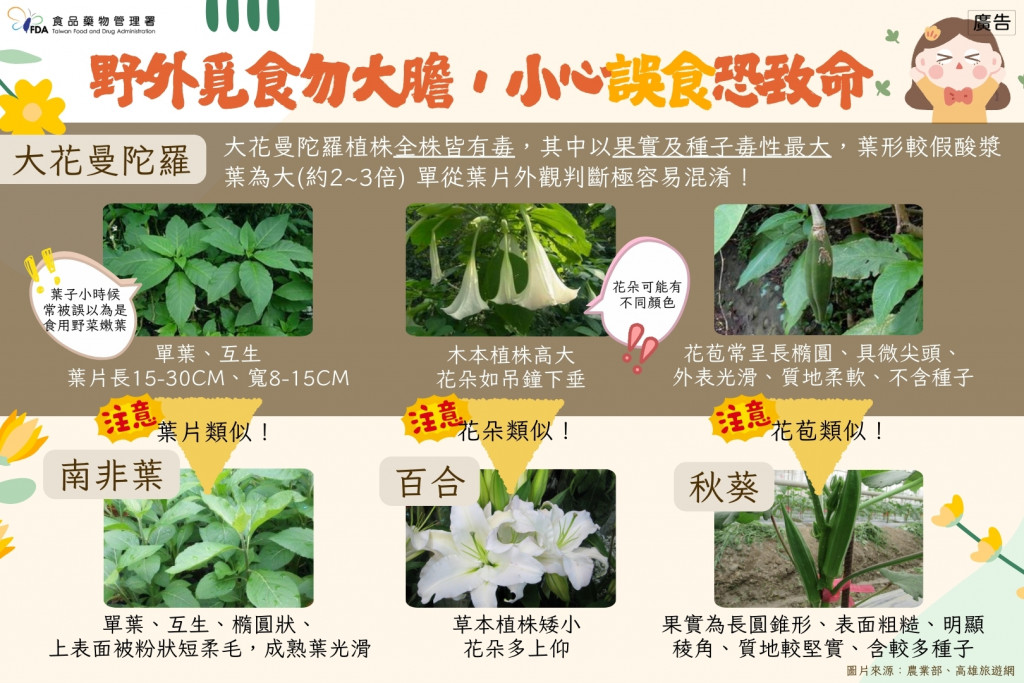 衛生福利部食品藥物管理署近期接獲通報民眾於野外自行採摘誤食大花曼陀羅葉片致中毒事件,為防範憾事再發,爰提供大花曼陀羅宣導文宣;另有關其他植物性天然毒(如野生菇類、姑婆芋等)之相關介紹,已同步置於該署官方網站「防治食品中毒專區」(網址:http://www.fda.gov.tw/TC/siteContent.aspx?sid=11538)衛生福利部食品藥物管理署近期接獲通報民眾於野外自行採摘誤食大花曼陀羅葉片致中毒事件,為防範憾事再發,爰提供大花曼陀羅宣導文宣;另有關其他植物性天然毒(如野生菇類、姑婆芋等)之相關介紹,已同步置於該署官方網站「防治食品中毒專區」(網址:http://www.fda.gov.tw/TC/siteContent.aspx?sid=11538)