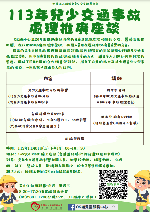財團法人靖娟兒童安全文教基金會辦理兒少交通事故處理推廣座談,期待透過對話方式從交通、心理、社會等角度分享中心協助處理交通事故的服務經驗傳達給更多相關工作者,讓不同專業之間以同理的態度更了解彼此,一同協助為孩子謀取最大的利益。